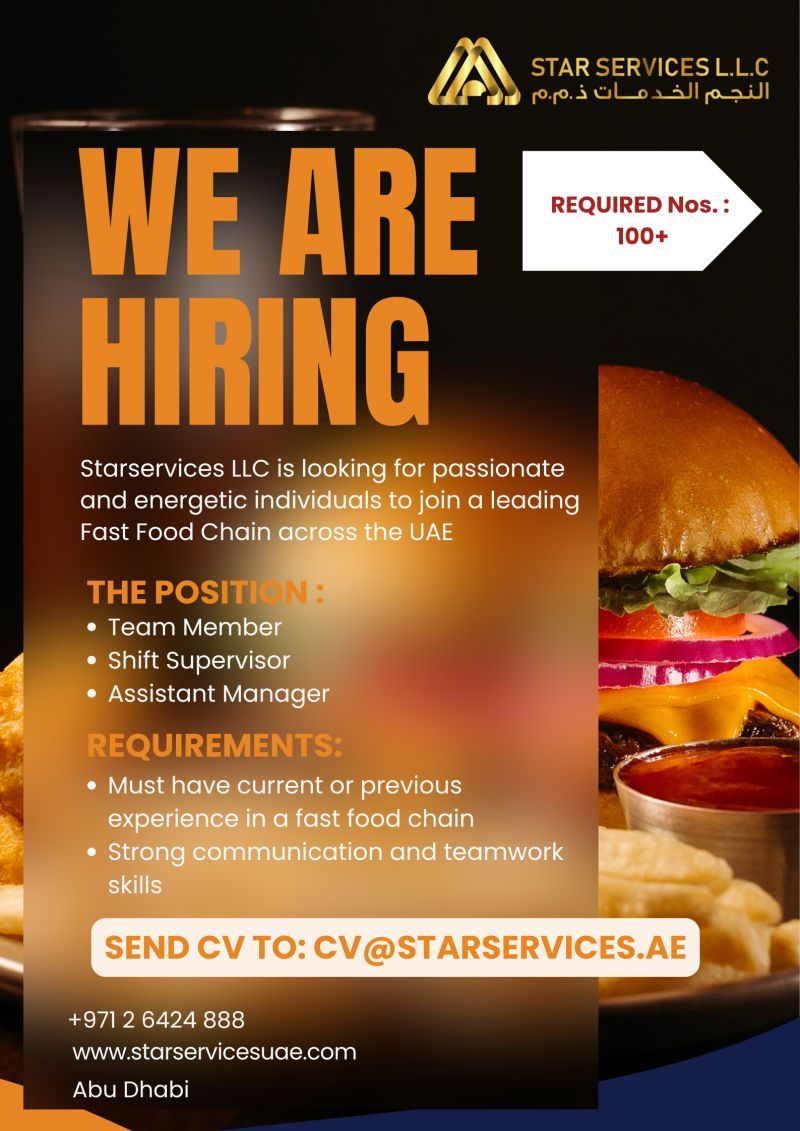 تعلن Star Services L.L.C عن توظيف فوري لأكثر من 100 موظف للعمل ضمن سلسلة مطاعم وجبات سريعة رائدة في دولة الإمارات.