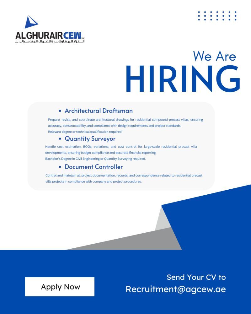 تعلن Al Ghurair CEW LLC عن فتح باب التوظيف لعدد من الوظائف الهندسية والإدارية ضمن مشاريع فلل سكنية Precast واسعة النطاق في دولة الإمارات.