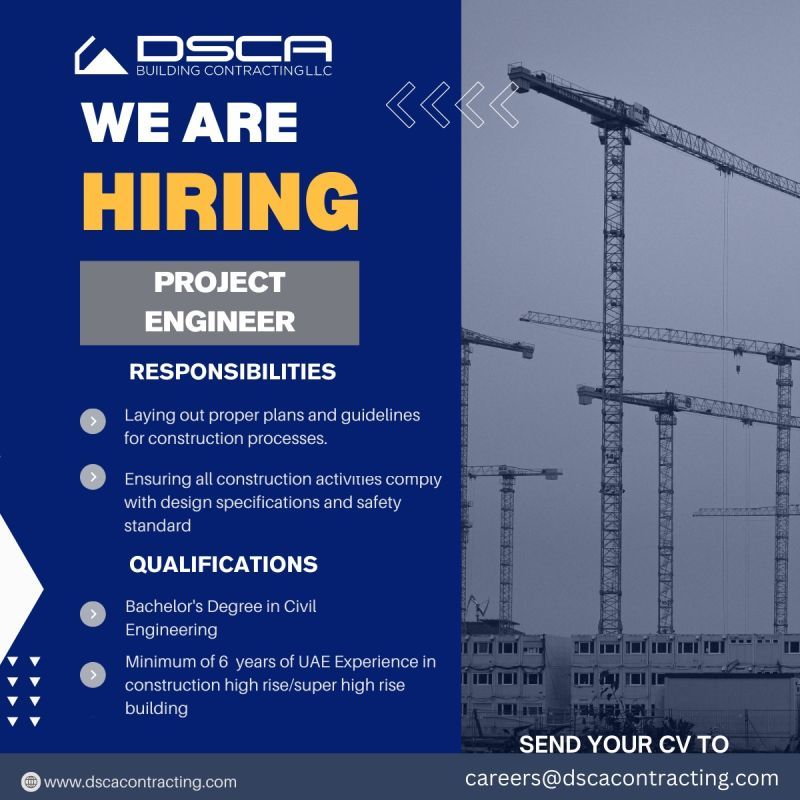 تعلن DSCA Building Contracting LLC، إحدى شركات المقاولات الرائدة في الإمارات، عن حاجتها إلى Project Engineer للانضمام إلى فريقها والعمل على مشاريع أبراج عالية وسوبر هاي رايز.