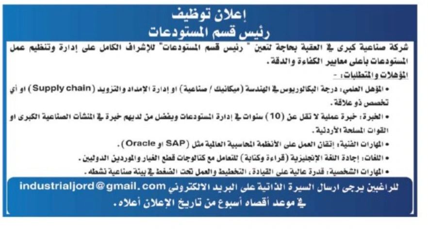 تُعلن شركة صناعية كبرى في العقبة عن حاجتها إلى تعيين رئيس قسم المستودعات للإشراف الكامل على إدارة وتنظيم أعمال المستودعات، وفق أعلى معايير الكفاءة والدقة وسلامة المخزون.