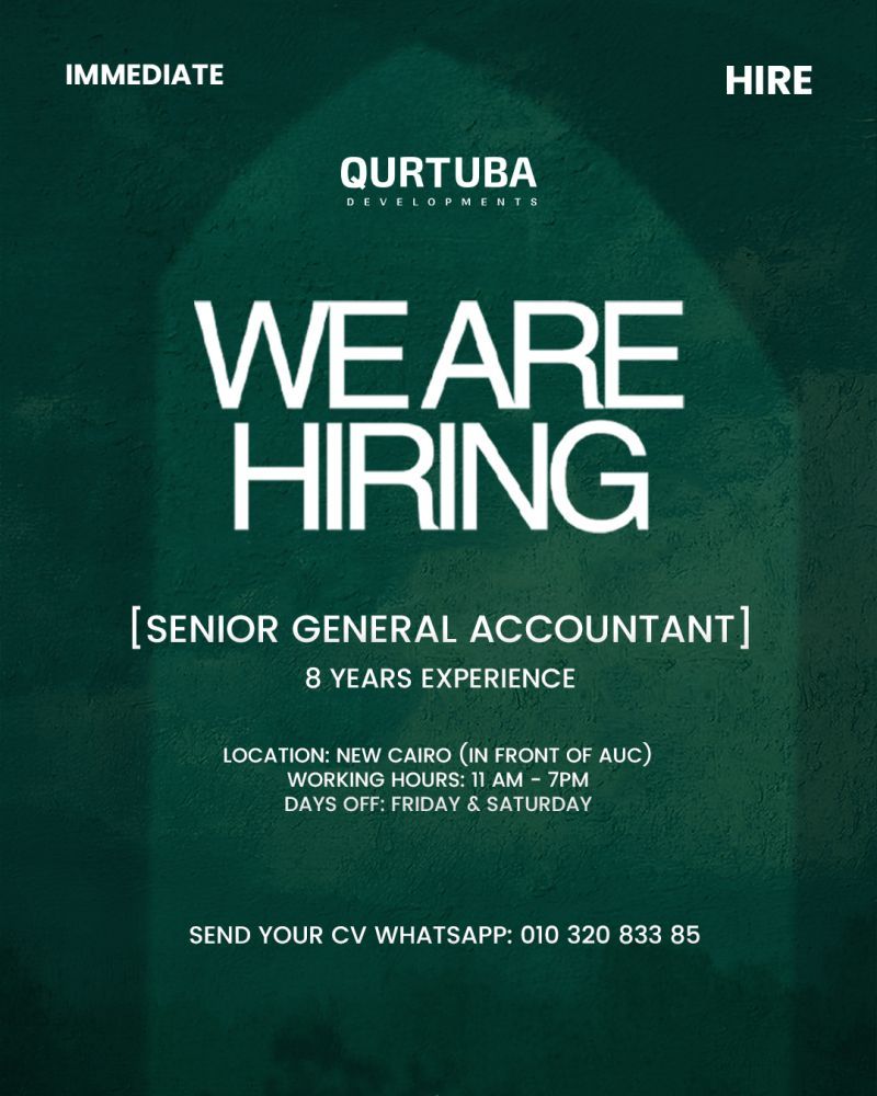 تعلن Qurtuba Developments عن حاجتها إلى محاسب عام أول (Senior General Accountant) للانضمام إلى فريق مالي محترف ضمن بيئة عمل مستقرة ومنظمة.