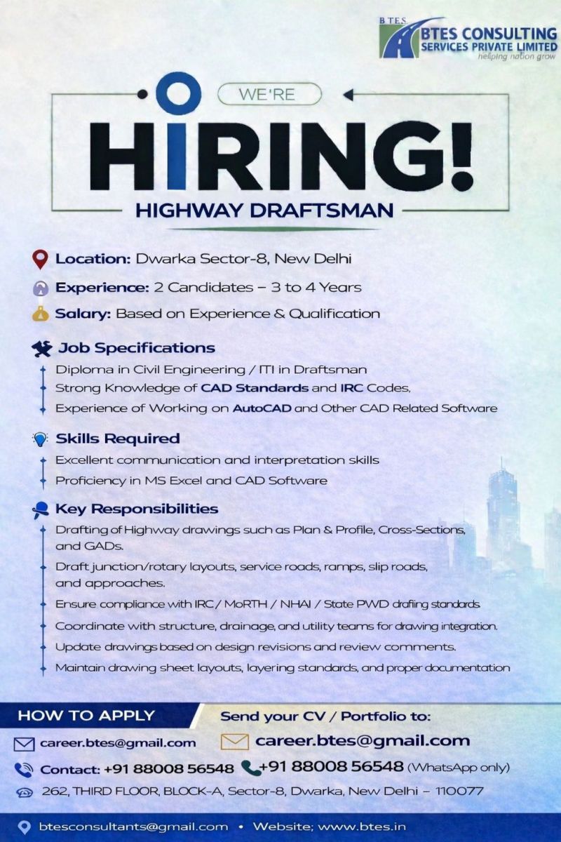 تعلن BTES Consulting Services Pvt. Ltd. عن حاجتها إلى Highway Draftsman محترف للعمل على مشاريع طرق وبنية تحتية كبرى، ضمن فريق هندسي متخصص وبيئة عمل احترافية.