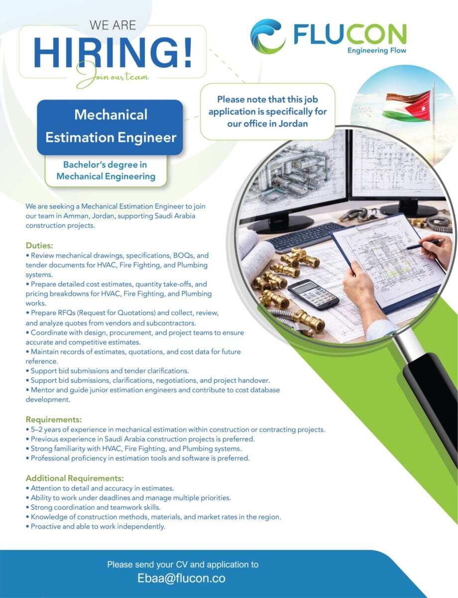 شركة FLUCON – Engineering Flow تعلن عن حاجتها لمهندس تقدير تكاليف ميكانيكي للانضمام إلى فريقها في عمّان – الأردن والعمل على مشاريع إنشائية كبرى في المملكة العربية السعودية.