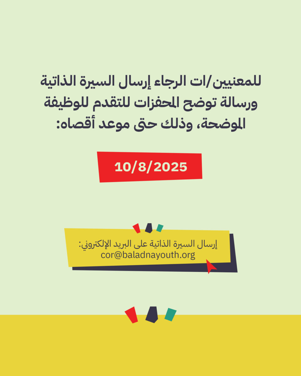 تعلن جمعية الشباب العرب – بلدنا عن حاجتها لتعيين مدير/ة مشاريع (نائب مديرة) للعمل بنسبة 75%، وذلك وفقًا للشروط التالية: