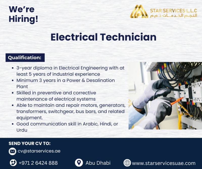 تعلن Star Services L.L.C عن حاجتها إلى فني كهرباء (Electrical Technician) ذو خبرة للعمل في محطات الطاقة وتحلية المياه في أبوظبي.