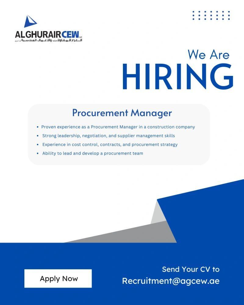 تعلن Al Ghurair CEW LLC عن حاجتها إلى مدير مشتريات (Procurement Manager) للانضمام إلى فريقها في قطاع المقاولات والمشاريع الهندسية.