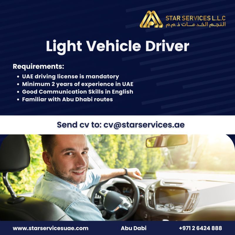 تُعلن Star Services L.L.C عن حاجتها إلى سائق سيارة خفيفة (Light Vehicle Driver) للعمل فورًا ضمن فريقها المحترف.