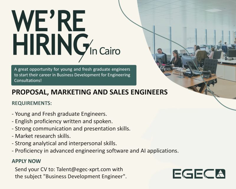 تعلن EGECA عن فتح باب التوظيف لـ Proposal, Marketing & Sales Engineers للعمل في مقر الشركة بالقاهرة.