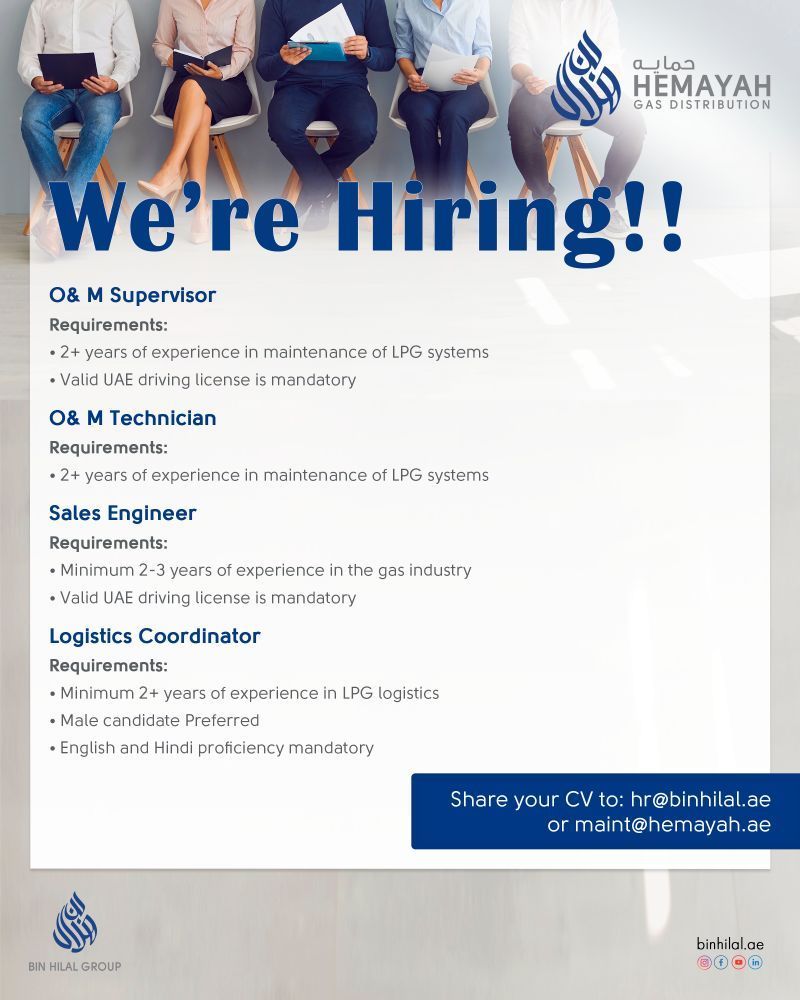 شركة Hemayah Gas Distribution – مجموعة بن هلال تعلن عن وظائف شاغرة متعددة لأصحاب الخبرة والراغبين بالانضمام إلى فريق احترافي في بيئة عمل قوية ومستقرة.