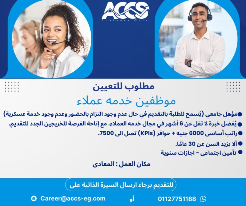 تُعلن شركة ACCS Business Gate عن حاجتها إلى موظفين خدمة عملاء للعمل من مقر الشركة في المعادي ضمن بيئة عمل احترافية وفرص نمو حقيقية.