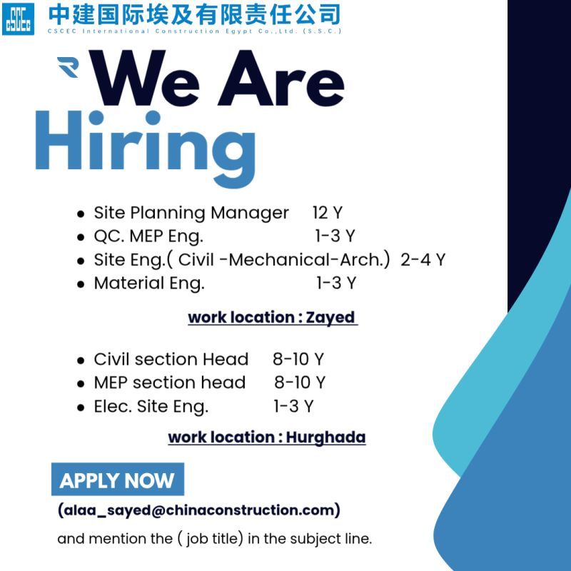 تعلن شركة CSCEC – China State Construction Engineering Corporation عن فتح باب التعيين لعدد من الوظائف الهندسية المميزة للعمل في مشروعاتها داخل مصر، وذلك في زايد والغردقة.