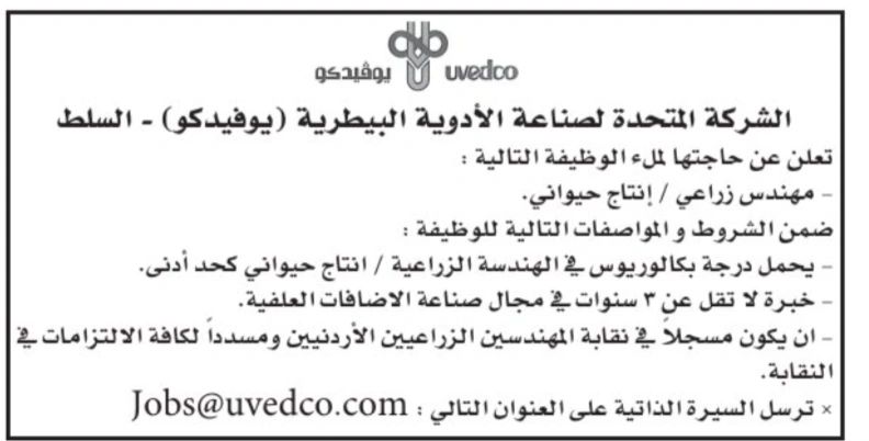 تعلن الشركة المتحدة لصناعة الأدوية البيطرية (Uvedco – يوڤيدكو)، إحدى الشركات الرائدة في مجال الصناعات البيطرية في الأردن، عن حاجتها لتعيين: