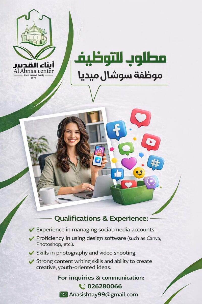 نادي أبناء القدس يعلن عن شاغر وظيفي لموظفة سوشال ميديا بنسبة وظيفة 50%، ضمن بيئة شبابية محفّزة وفرصة حقيقية للتأثير وصناعة محتوى هادف في القدس.