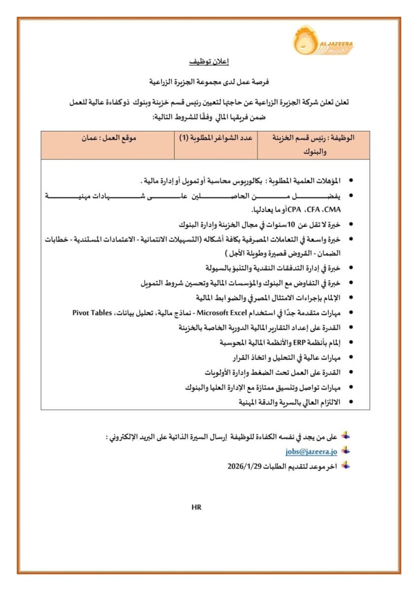 تعلن شركة الجزيرة الزراعية عن توفر فرصة عمل مميزة ضمن فريقها المالي لوظيفة رئيس قسم الخزينة والبنوك في مقرها بمدينة عمّان.