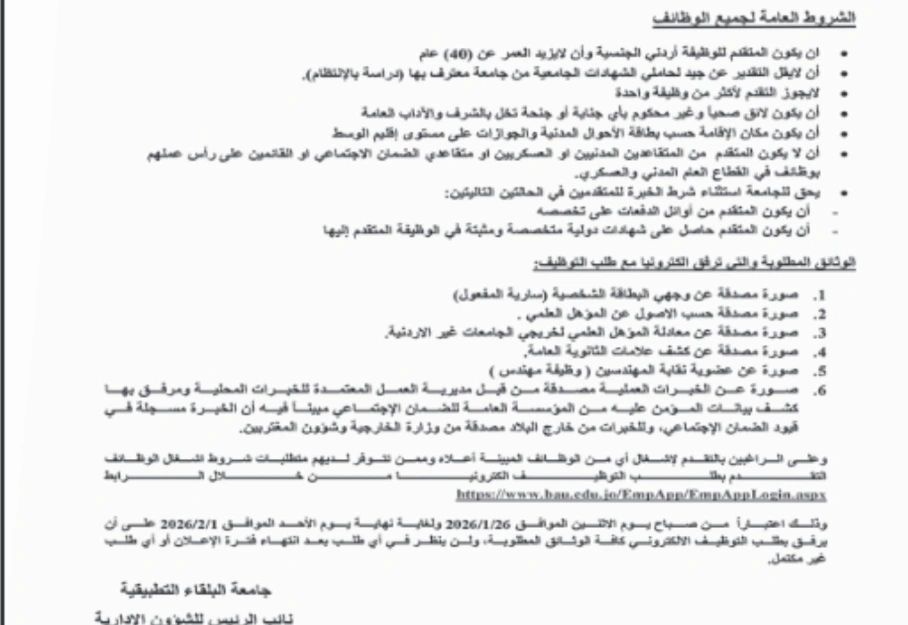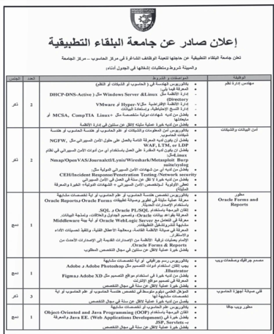 أعلنت جامعة البلقاء التطبيقية عن فتح باب التوظيف لعدد من الوظائف الشاغرة في تخصصات تقنية وإدارية مميزة، ضمن شروط واضحة وتقديم إلكتروني مباشر.