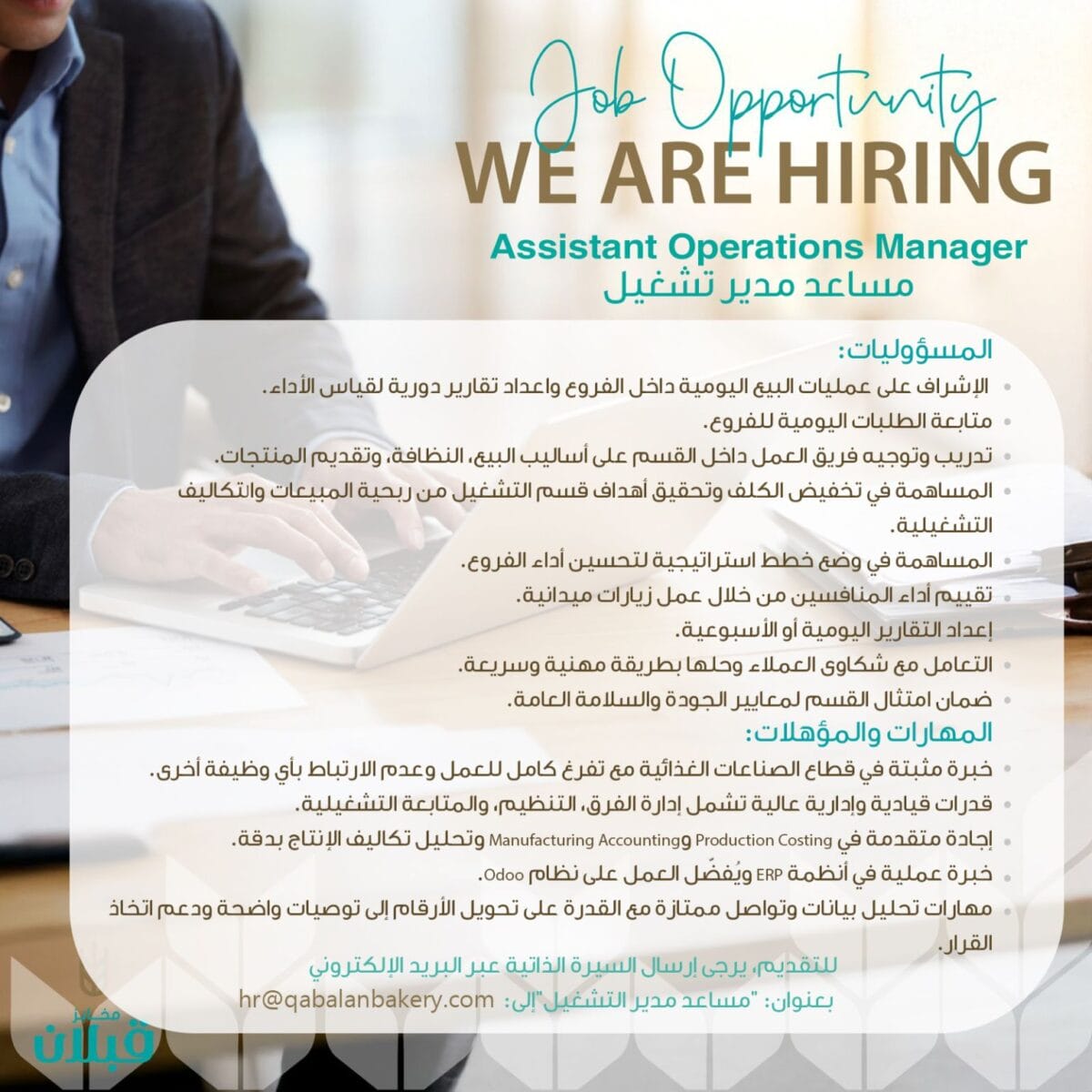 مع كتابة مساعد مدير تشغيل – عمّان في عنوان البريد الإلكتروني.