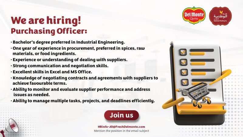 تعلن شركة غذائية كبرى عن حاجتها لتعيين مسؤول مشتريات (Purchasing Officer) للانضمام إلى فريقها، ضمن بيئة عمل احترافية تعتمد أعلى معايير الكفاءة والجودة في إدارة سلاسل التوريد.