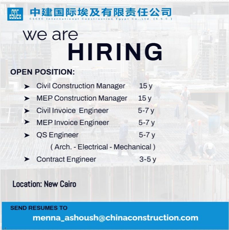 تعلن CSCEC International Construction Egypt Co., Ltd عن فتح باب التوظيف فورًا لعدد من الوظائف الهندسية القيادية والتنفيذية للعمل في مشروعات كبرى بالقاهرة الجديدة.