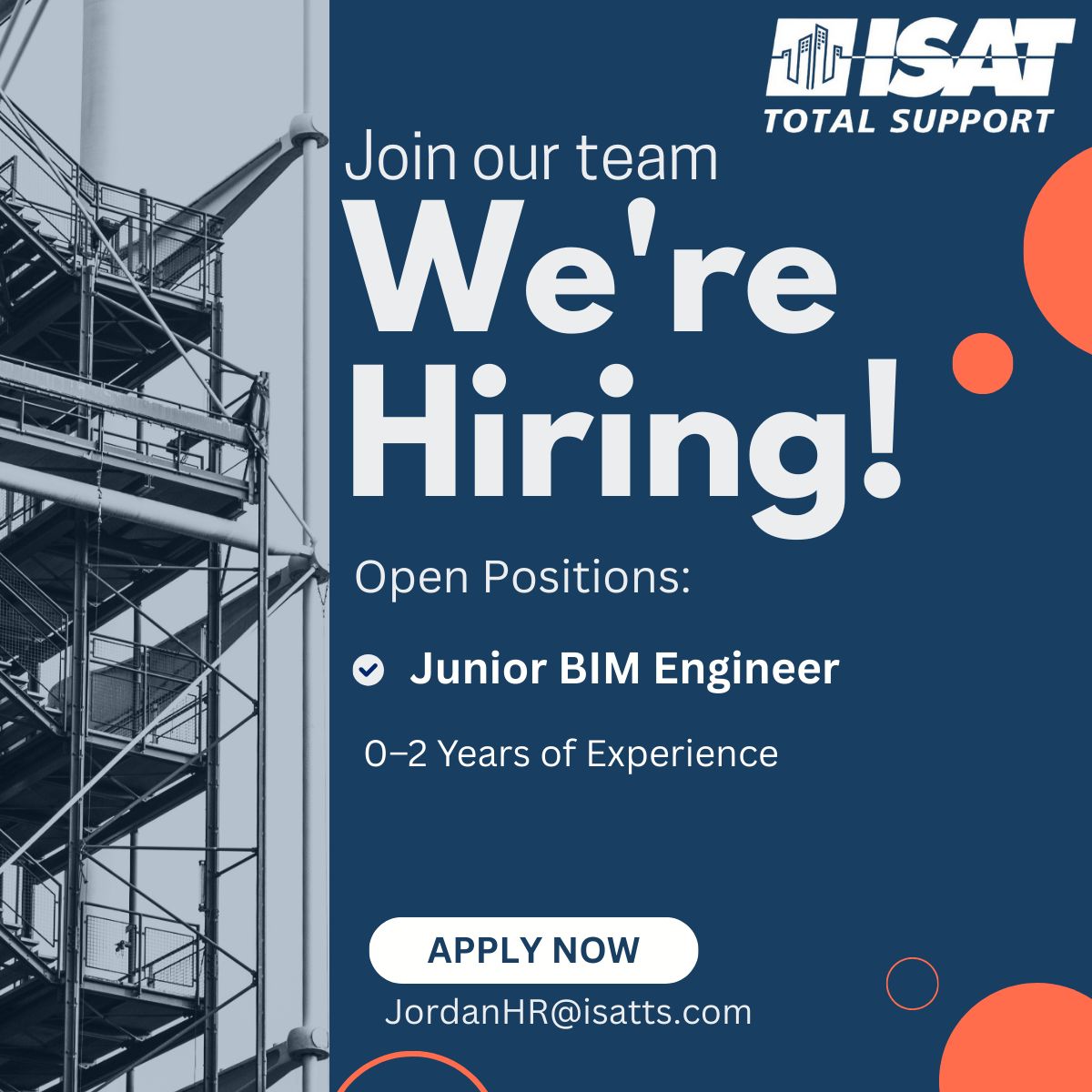 تعلن ISAT Total Support عن وظيفة Junior BIM Engineer، للعمل ضمن فريق يبتكر ويطور المشاريع الهندسية باستخدام أحدث تقنيات BIM.