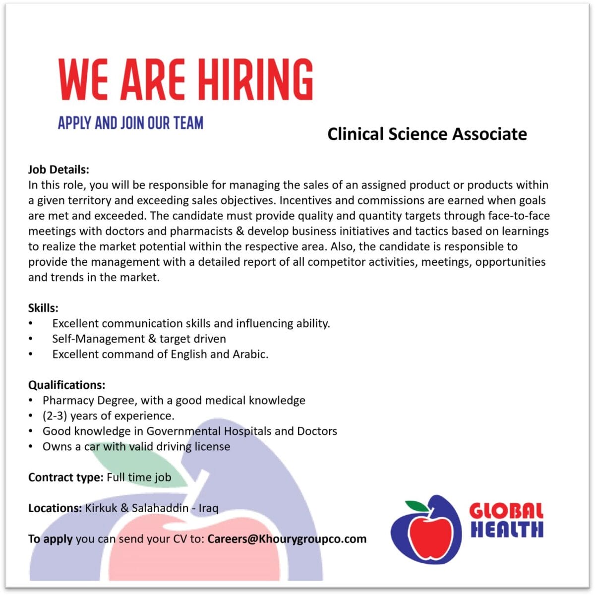 تعلن Global Health – Khoury Group عن حاجتها لتعيين Clinical Science Associate للعمل بدوام كامل ضمن مناطق كركوك وصلاح الدين، مع نظام حوافز وعمولات مجزية مبنية على تحقيق الأهداف.