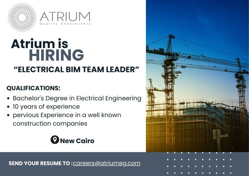 Electrical BIM Team Leader للعمل ضمن مشاريع إنشائية كبرى في القاهرة الجديدة.
