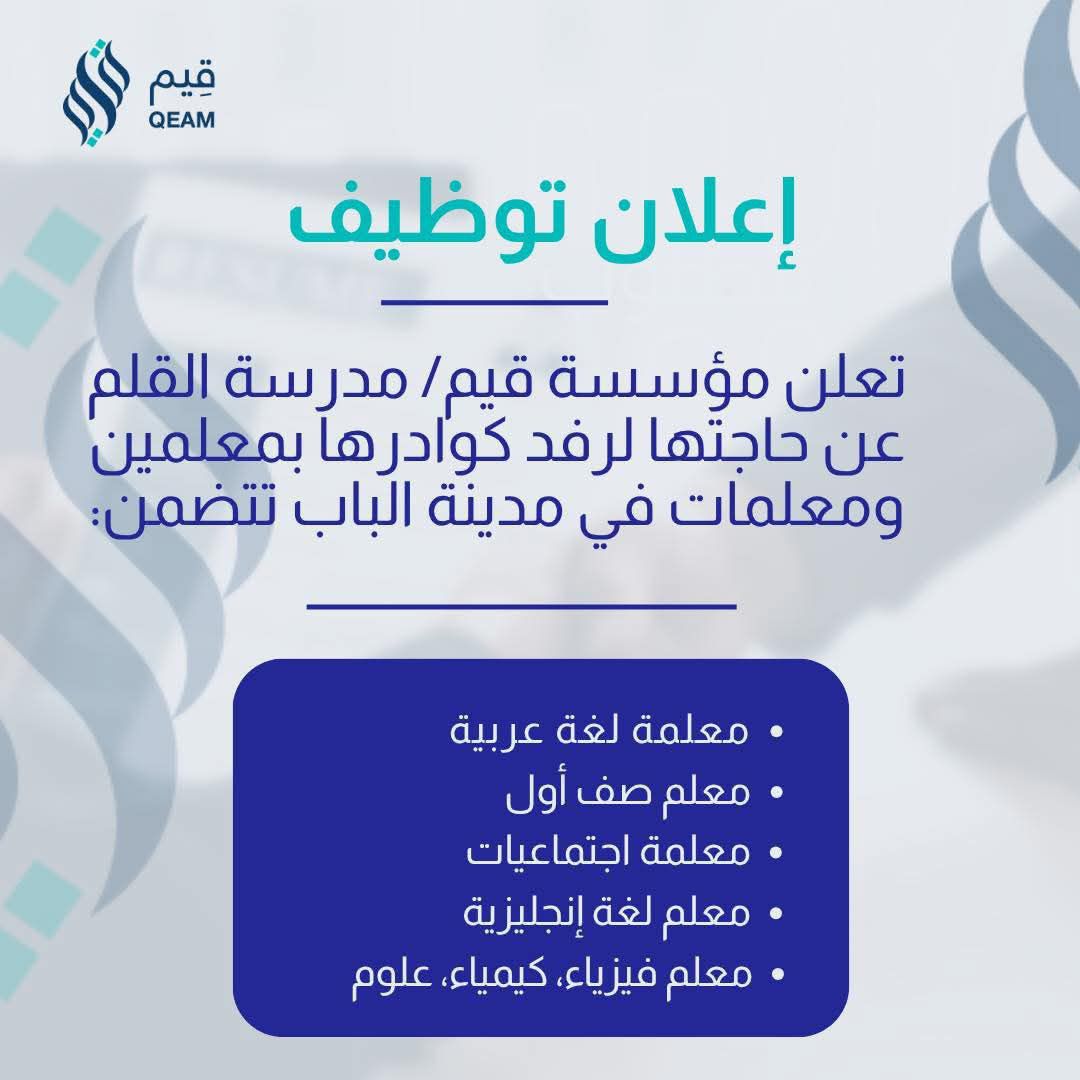 مؤسسة قيم تفتح باب التوظيف في مدرسة القلم النموذجية بمدينة الباب للوظائف التالية:
