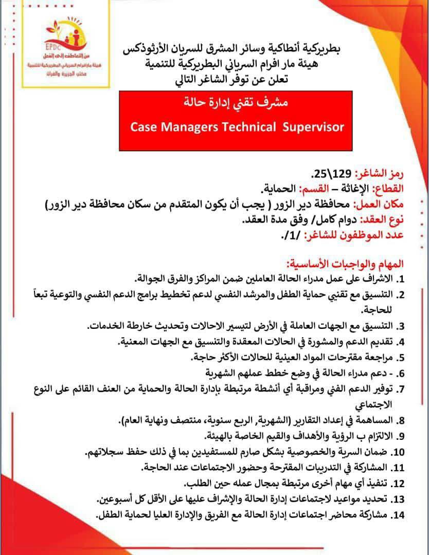 تُعلن هيئة مار أفرام السرياني البطريركية للتنمية – مكتب الحماية والطفولة عن حاجتها لتعيين: