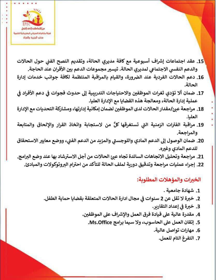 خبرة لا تقل عن 3 سنوات في إدارة الحالات الخاصة بحماية الطفل.