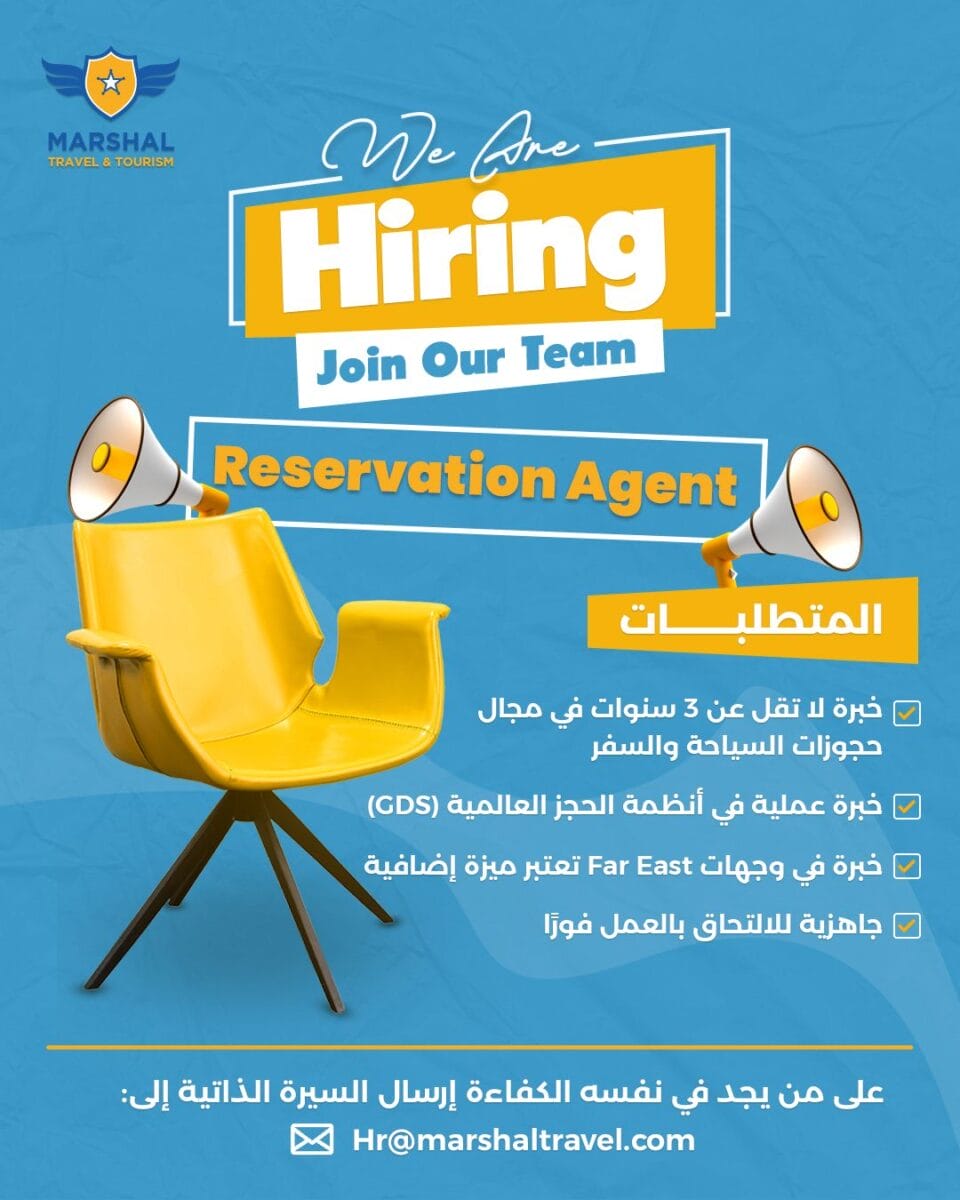 شركة Marshal Travel & Tourism تعلن عن حاجتها إلى Reservation Officer محترف للانضمام إلى فريقها فورًا.