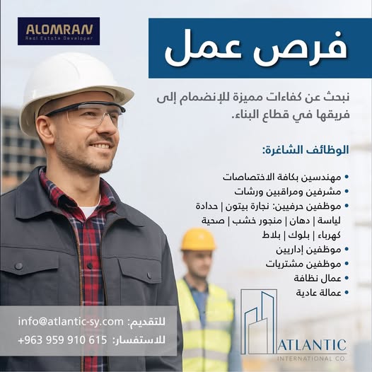 🔹 نبحث عن كوادر مهنية للعمل ضمن مشروع عقاري ضخم في مدينة حمص، ضمن التخصصات التالية: