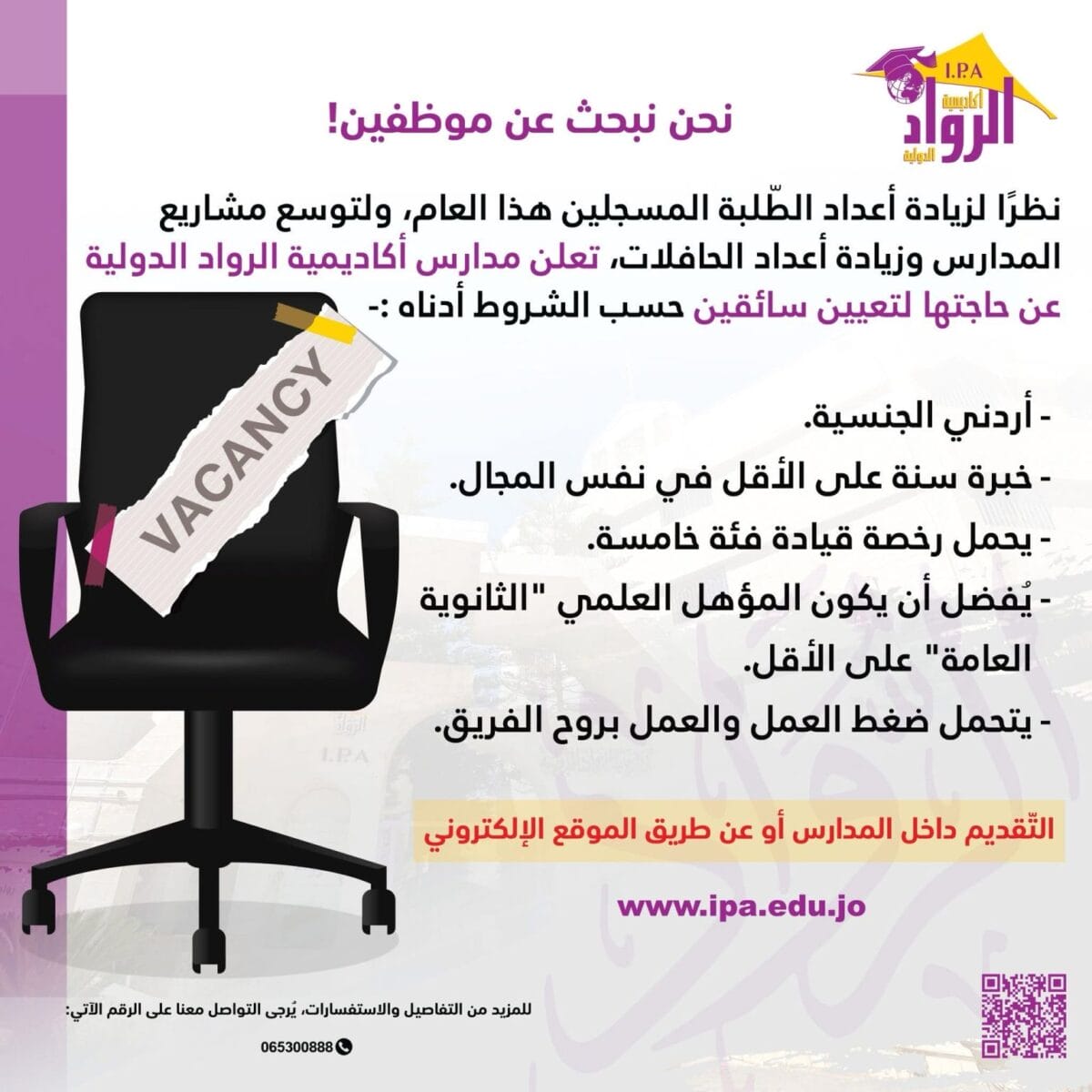 نظرًا للزيادة الكبيرة في أعداد الطلبة المسجلين هذا العام، وتوسّع مشاريع المدارس وارتفاع عدد الحافلات، تُعلن أكاديمية الرواد الدولية (IPA) عن حاجتها إلى تعيين سائقين للعمل ضمن كادرها الإداري.