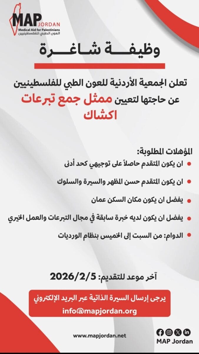تعلن الجمعية الأردنية للعون الطبي للفلسطينيين – MAP Jordan عن حاجتها لتعيين ممثل جمع تبرعات (أكشاك) للعمل ضمن فريقها في عمّان.