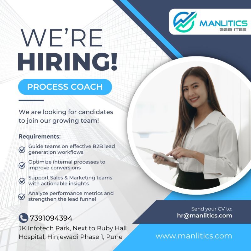 شركة Manlitics B2B ITES تفتح باب التوظيف لوظيفة Process Coach للانضمام إلى فريقها المتنامي والعمل في بيئة احترافية تعتمد على البيانات والنتائج.