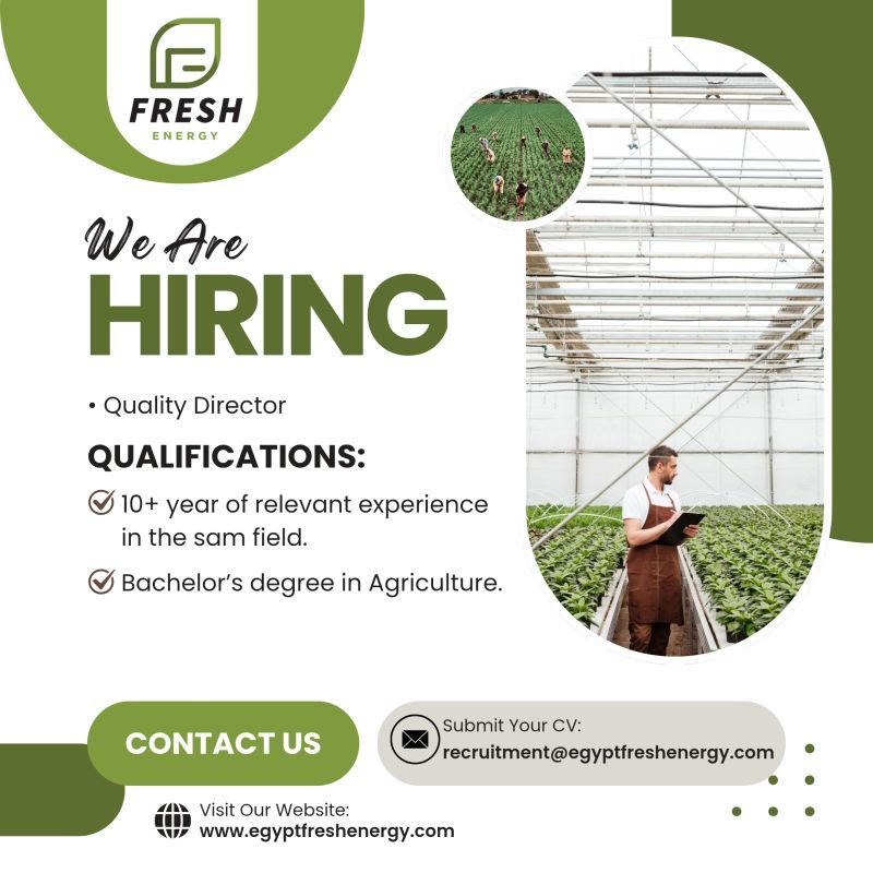 تعلن Fresh Energy عن فتح باب التوظيف لوظيفة Quality Director للانضمام إلى فريقها المتخصص في الزراعة الحديثة والطاقة المستدامة.