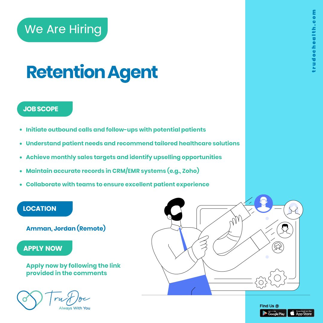 شركة طرو دوك في عمان توفر فرصة عمل موظف احتفاظ عملاء (Retention Agent) بدوام كامل وعمل عن بعد، لدعم نمو المبيعات وبناء علاقات قوية مع المرضى المحتملين.