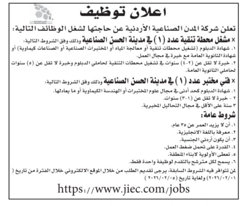 تعلن شركة المدن الصناعية الأردنية عن حاجتها لتوظيف عدد من الكوادر المؤهلة لشغل الوظائف التالية في مدينة الحسن الصناعية، ضمن الشروط التالية: