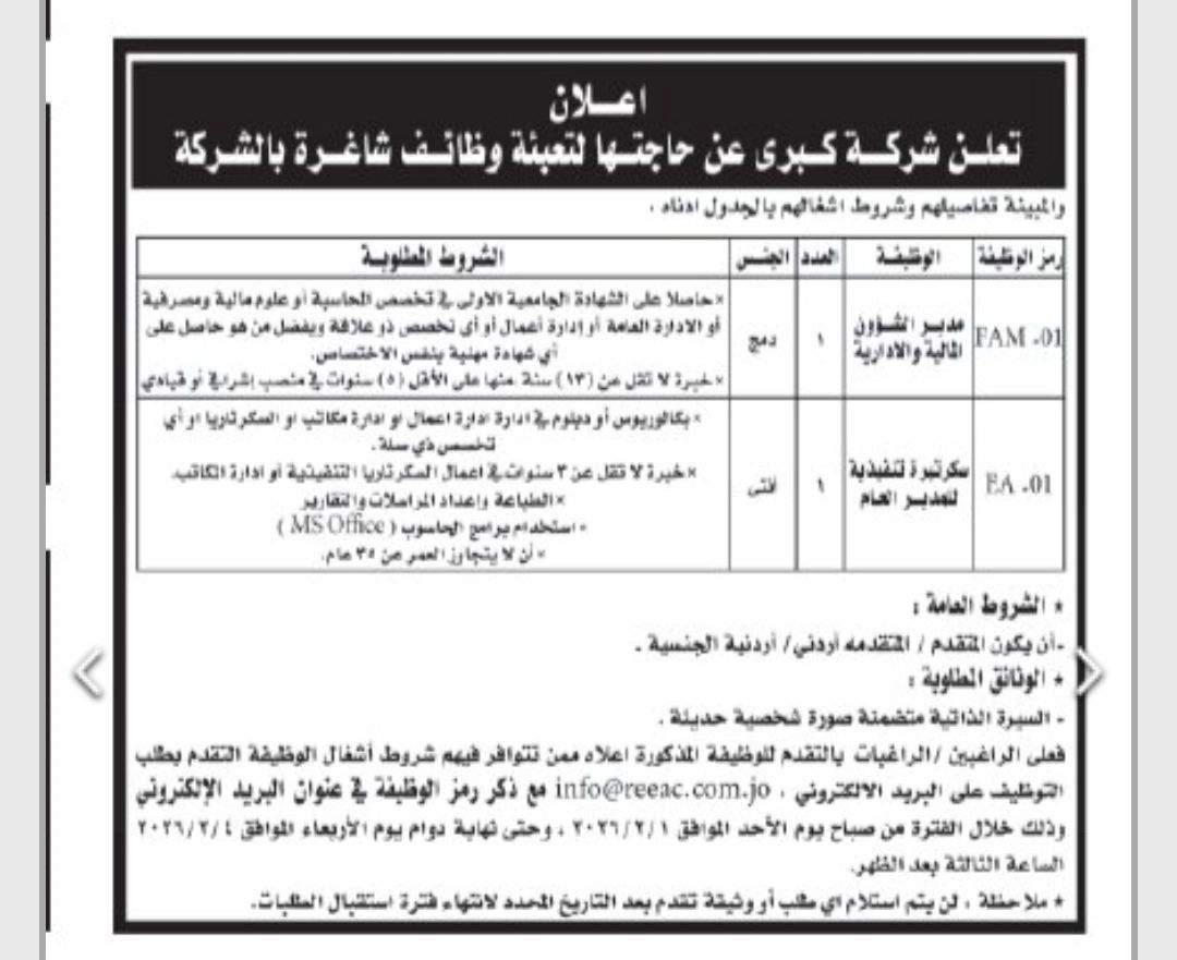 تعلن شركة كبرى رائدة في الأردن عن حاجتها لتعيين كفاءات مهنية مميزة لشغل الوظائف الإدارية التالية، ضمن بيئة عمل احترافية وفرص نمو حقيقية: