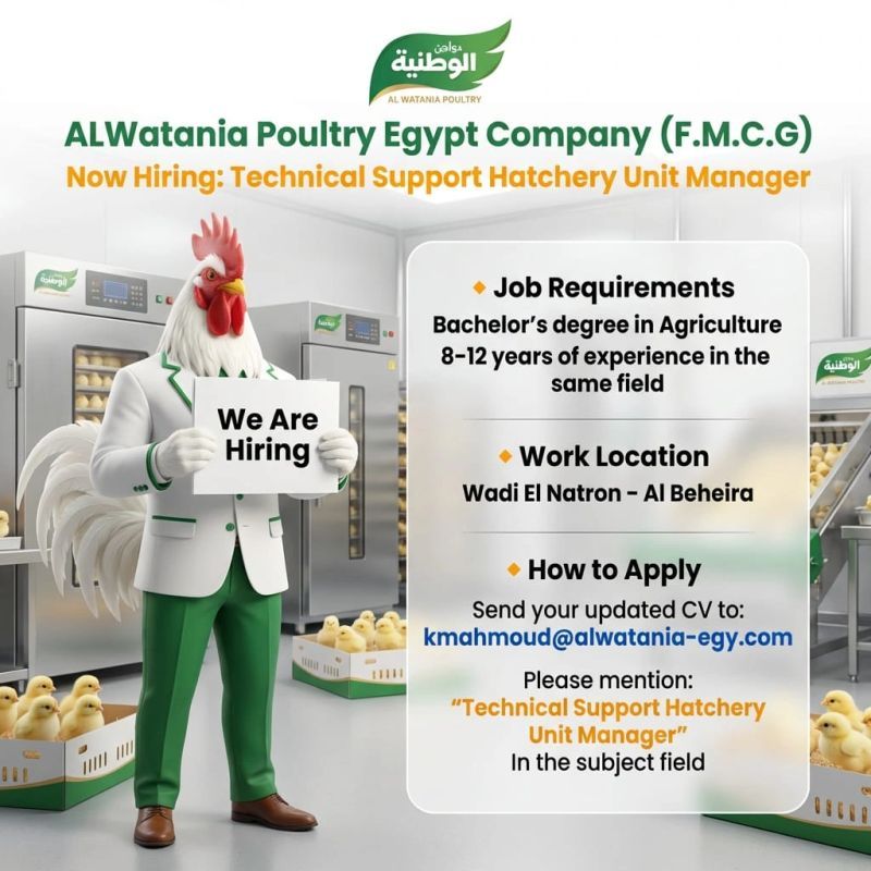 تعلن شركة الوطنية للدواجن – مصر عن حاجتها لتعيين Technical Support Hatchery Unit Manager لقيادة عمليات المفرخات بكفاءة عالية وتحقيق أفضل نتائج تشغيلية وجودة إنتاج.