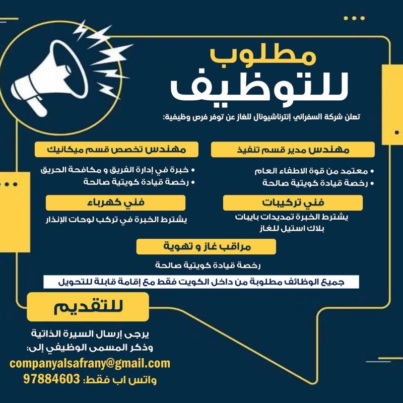 تعلن شركة السافراني إنترناشيونال للغاز عن توفر فرص عمل فورية داخل الكويت لعدد من التخصصات الهندسية والفنية، ضمن مشاريع نشطة وببيئة عمل مستقرة.