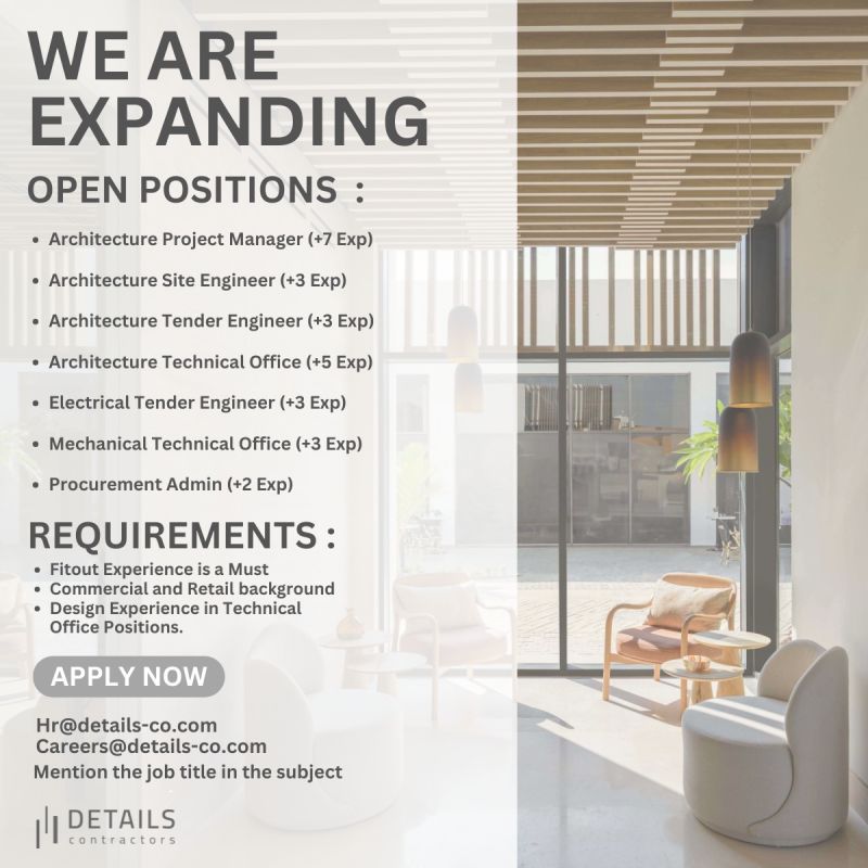 شركة DETAILS Contractors تعلن عن فتح باب التوظيف الفوري لعدد من التخصصات الهندسية والإدارية ضمن مشاريع Commercial & Retail Fit-Out.
