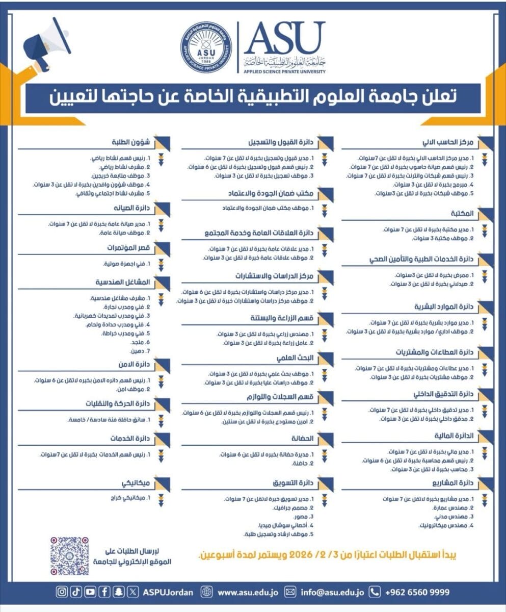 تُعلن جامعة العلوم التطبيقية الخاصة (ASU) عن فتح باب التوظيف لعدد كبير من الوظائف الإدارية والفنية والهندسية والخدمية ضمن مختلف الدوائر والمراكز، وذلك ضمن شروط محددة وخبرات متفاوتة.