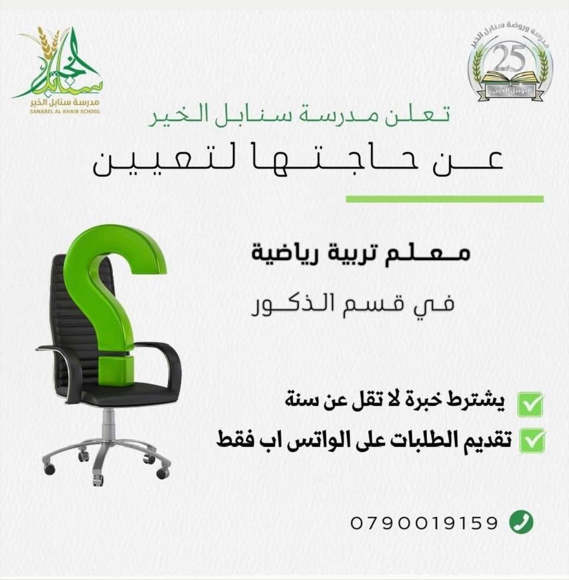 تُعلن مدرسة سنابل الخير عن توفر شاغر وظيفي لمعـلم تربية رياضية للعمل ضمن قسم الذكور، وذلك ضمن بيئة تعليمية ملتزمة تهدف لبناء الطالب علميًا وبدنيًا.