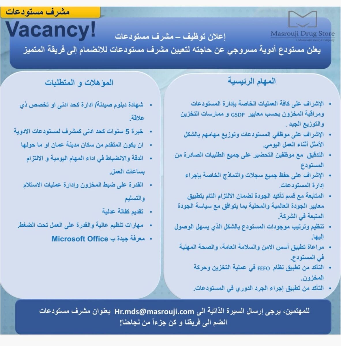 يعلن مستودع أدوية مسروجي (Masrouji Drug Store) عن توفر شاغر مشرف مستودعات للانضمام إلى فريقه المتميز في عمّان، ضمن بيئة عمل احترافية تطبّق أعلى معايير الجودة والتخزين الدوائي.