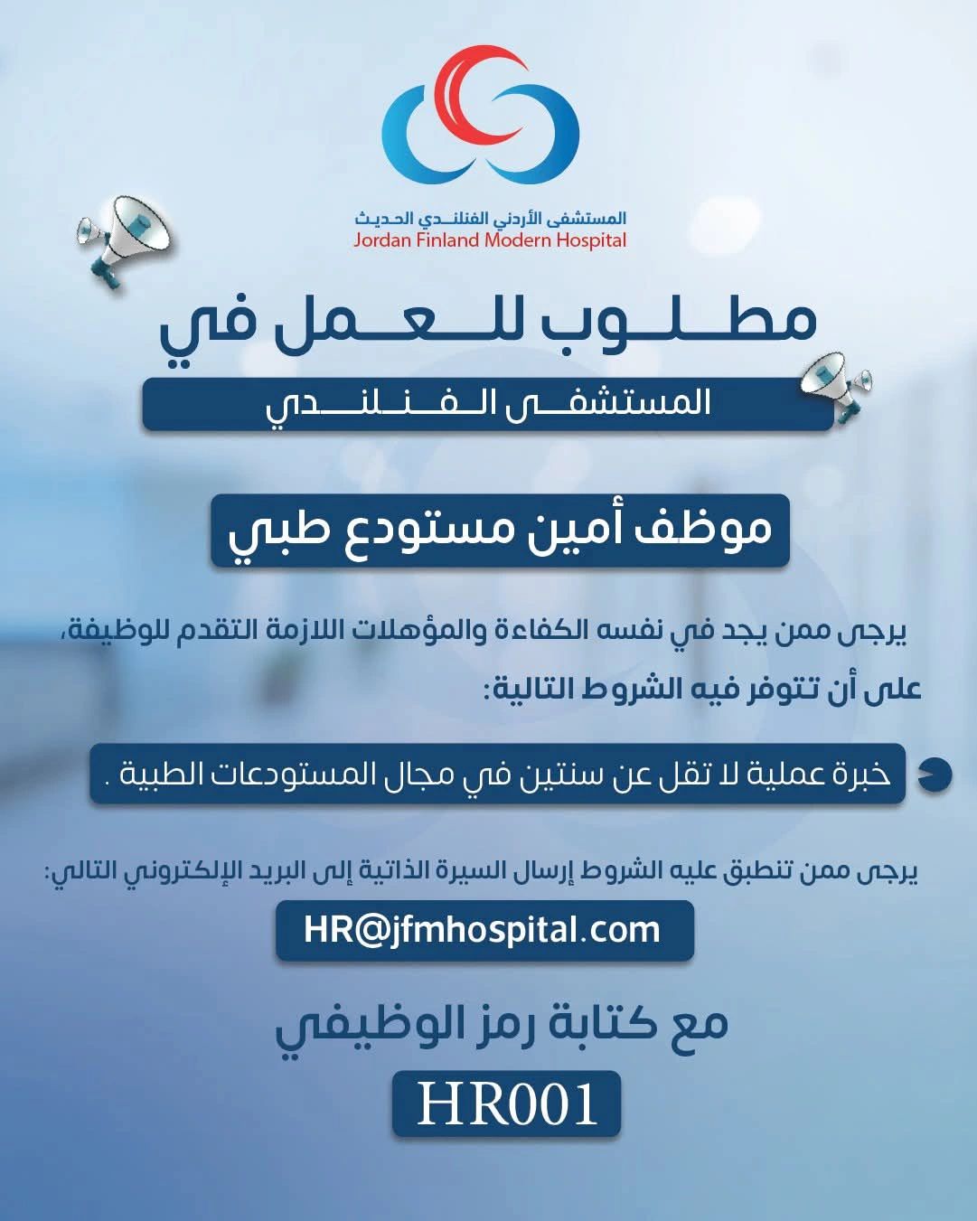 مطلوب أمين مستودع طبي للعمل في المستشفى الأردني الفنلندي الحديث