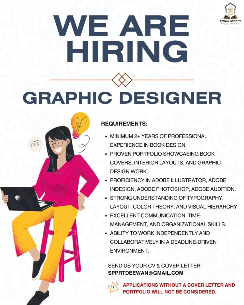 نبحث عن مصمم جرافيك مبدع ودقيق، قادر على تنفيذ تصاميم عالية الجودة للكتب المطبوعة والرقمية، والتعامل باحترافية مع المعلمين وفهم المحتوى التعليمي وتسليمه في الوقت المحدد.