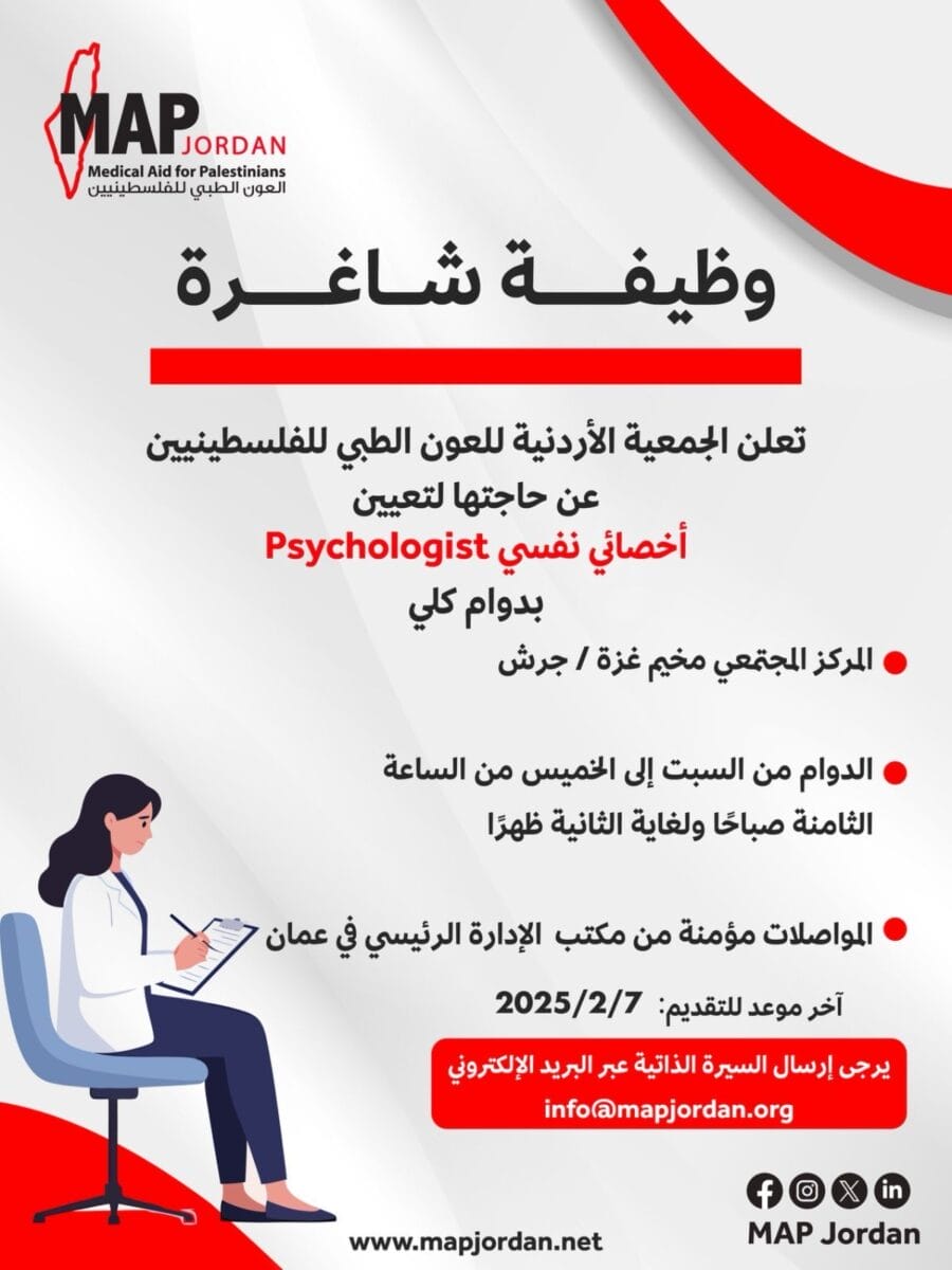 تُعلن الجمعية الأردنية للعون الطبي للفلسطينيين (MAP Jordan) عن حاجتها لتعيين أخصائي/ة نفسي بدوام كامل ضمن مركز صحي مخيم غزة – جرش.