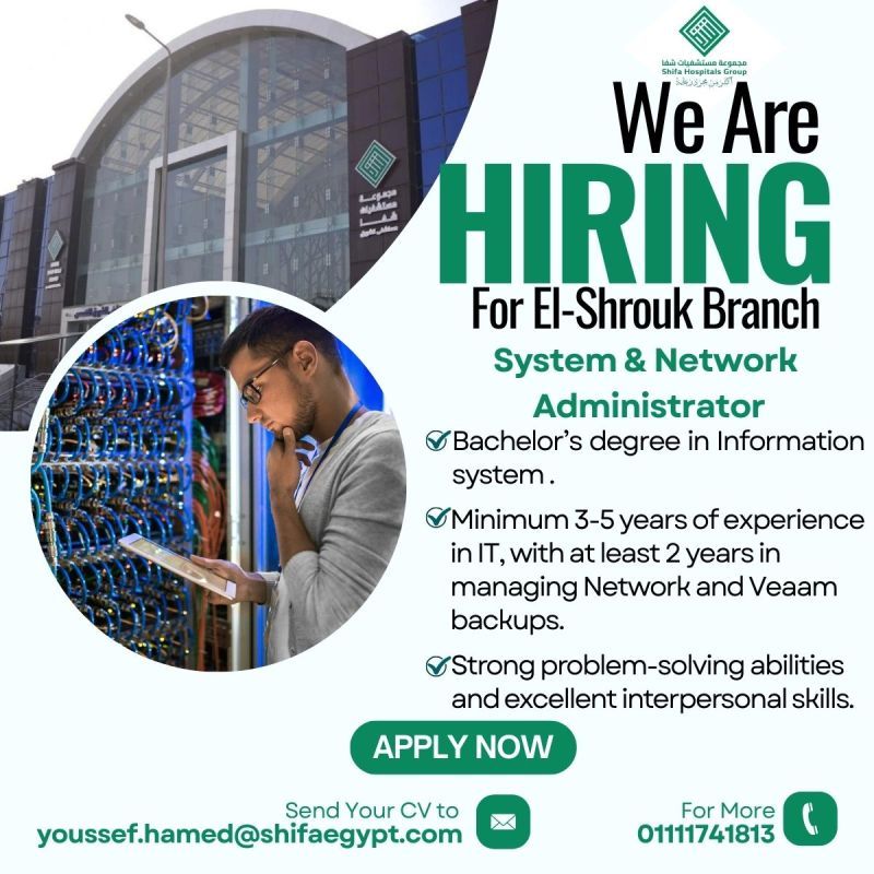 تعلن مجموعة مستشفيات شفا – فرع الشروق عن حاجتها إلى System & Network Administrator للانضمام فورًا إلى فريق تقني محترف داخل واحدة من أكبر المؤسسات الطبية في مصر.
