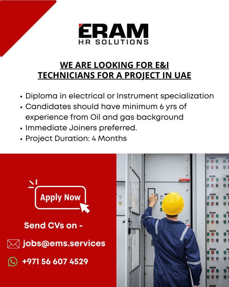 تعلن ERAM HR Solutions عن حاجتها إلى فنيي كهرباء وأجهزة قياس وتحكم (E&I Technicians) للعمل ضمن مشروع نفطي لفترة محدودة، مع أولوية للجاهزين للانضمام فورًا.