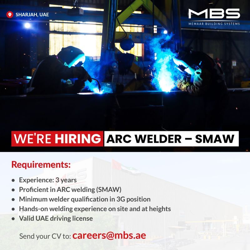 تعلن MBS – Memaar Building Systems عن فتح باب التوظيف لـ لحامين ARC (SMAW) للعمل ضمن مشاريعها الصناعية في إمارة الشارقة.