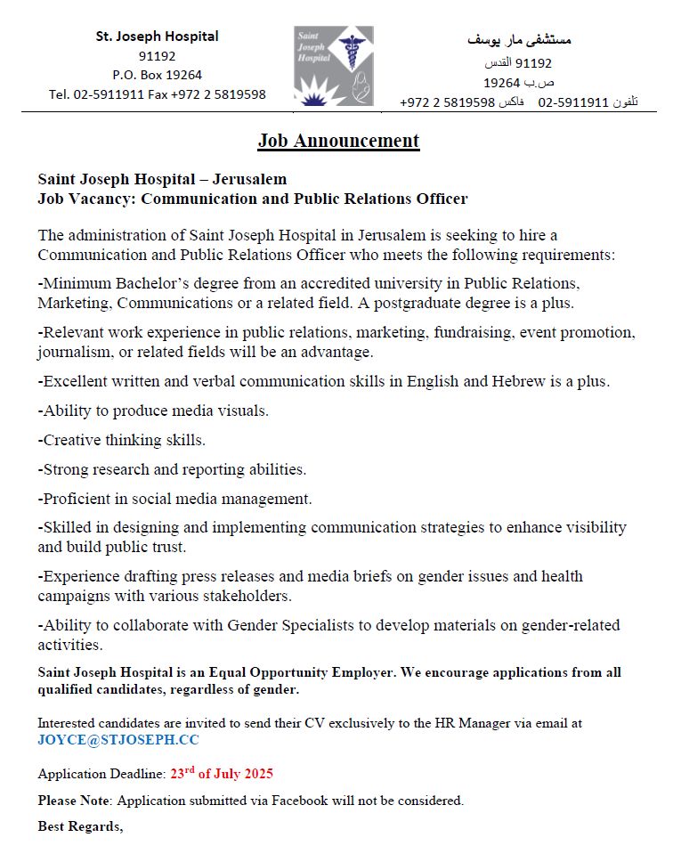 تعلن إدارة مستشفى سانت جوزيف (Saint Joseph Hospital) في القدس عن حاجتها لتوظيف مسؤول علاقات عامة واتصال (Communication and Public Relations Officer)، ضمن الشروط التالية: